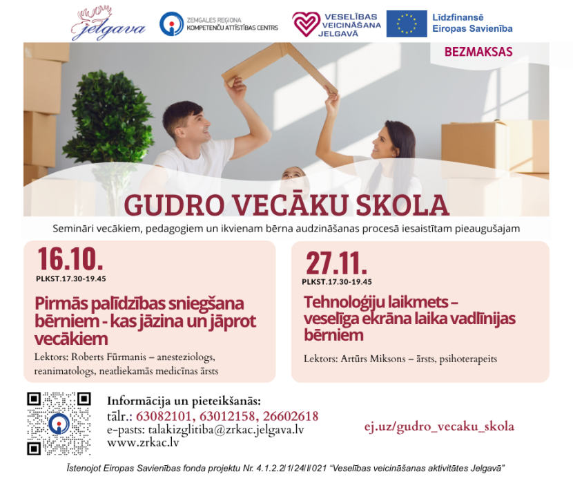 Zemgales reģiona kompetenču attīstības centrs (ZRKAC) aicina vecākus piedalīties Gudro vecāku skolas semināros, ko vadīs anesteziologs–reanimatologs, neatliekamās medicīnas ārsts Roberts Fūrmanis. Dalība pasākumos ir bez maksas, un tie notiks klātienē ZRKAC, Svētes ielā 33, Jelgavā.