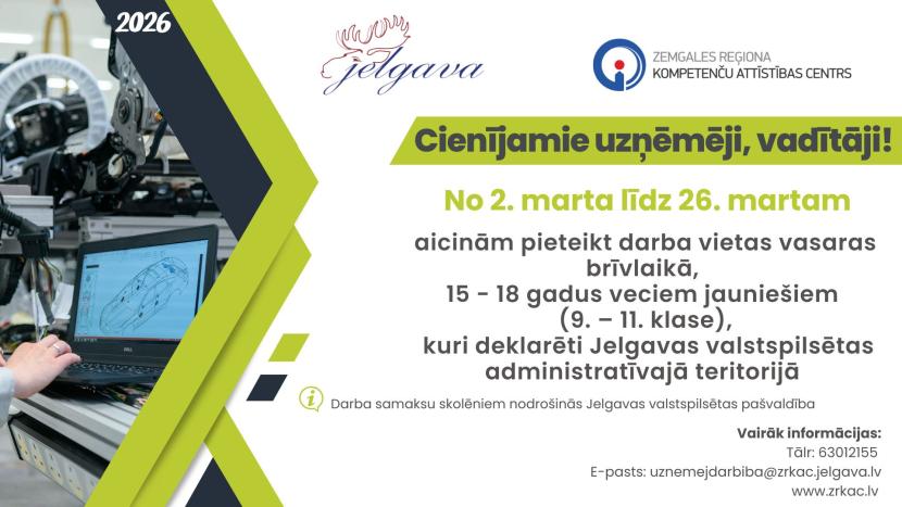 Zemgales reģiona kompetenču attīstības centrs (ZRKAC) no 2. marta līdz 26. martam aicina darba devējus pieteikt darba vietas 9., 10. un 11. klašu skolēniem nodarbinātībai vasaras brīvlaikā Jelgavā. Darba vietas var pieteikt uzņēmēji, biedrības, valsts un pašvaldības iestādes....