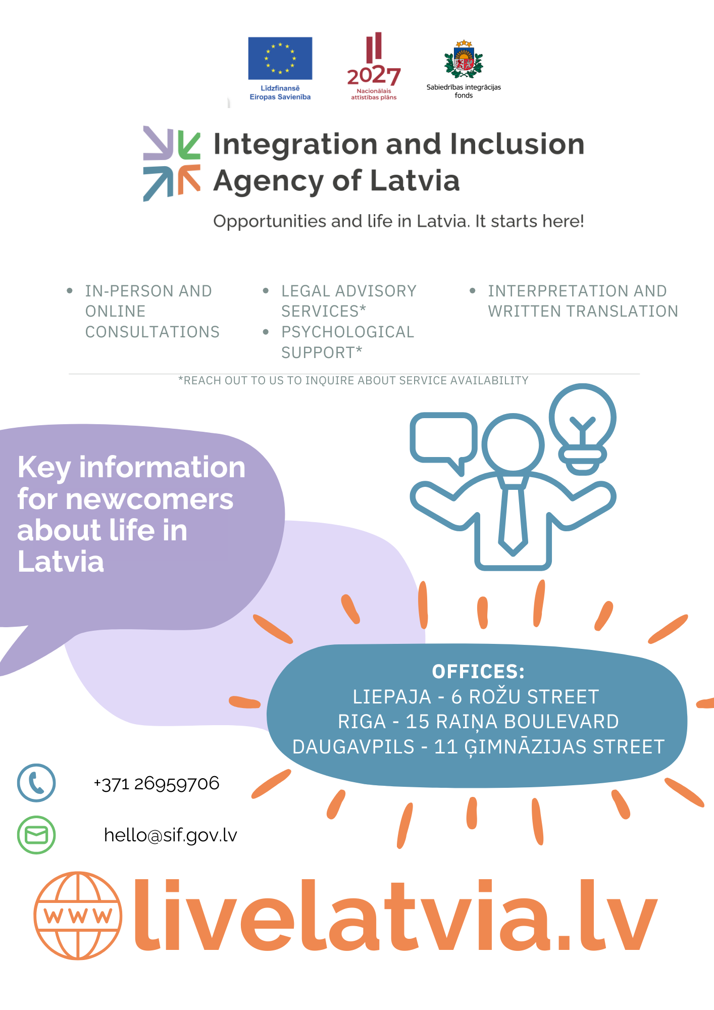Sabiedrības integrācijas fonda Vienas pieturas aģentūra (VPA) turpina darbu projekta 2. posmā (2026–2029), nodrošinot nacionālā līmeņa koordinējošu atbalstu jaunpienācējiem visā Latvijā. Aģentūras mērķis ir sniegt kvalitatīvu un savlaicīgu informāciju, praktisku palīdzību un emocionālu atbalstu trešo valstu pilsoņiem.