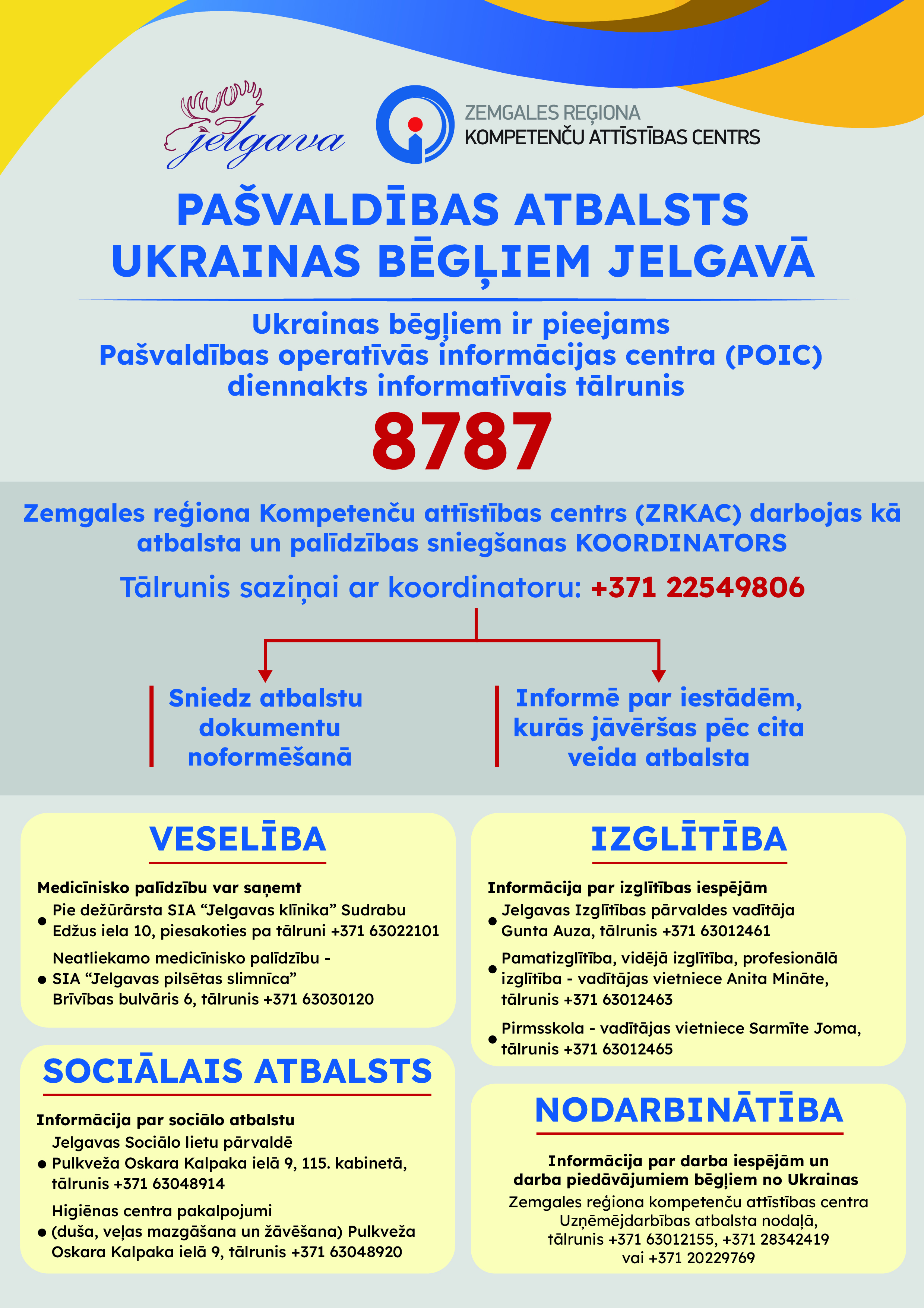 Jelgavas valstspilsētas pašvaldības iestāde “Zemgales reģiona Kompetenču attīstības centrs” (ZRKAC) darbojas kā palīdzības un atbalsta sniegšanas koordinators. Sazināties ar koordinatoru iespējams pa tālruni +371 22549806