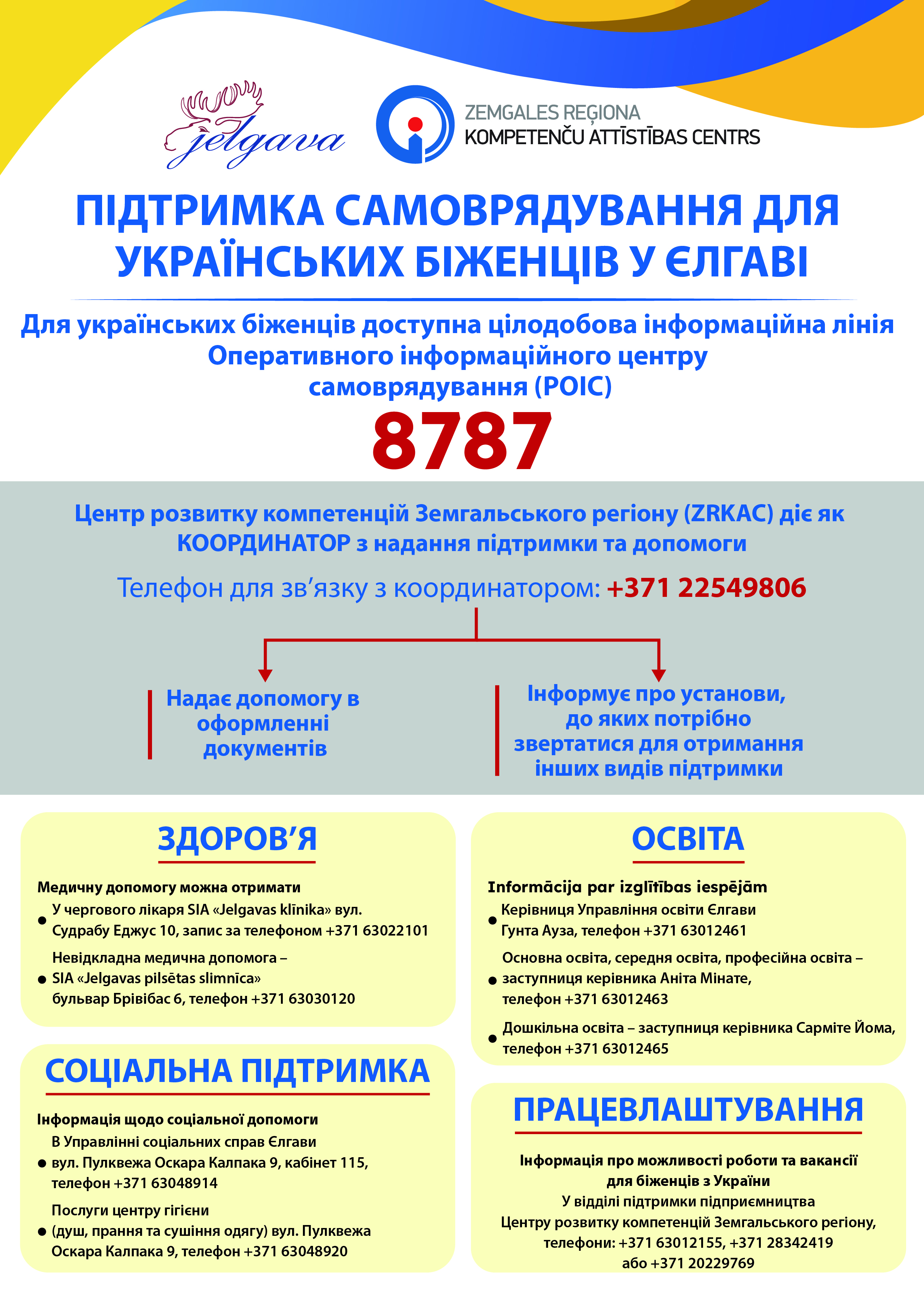 Установа самоуправління міста Єлгава “Zemgales reģiona Kompetenču attīstības centrs” Zemgales reģiona Kompetenču attīstības centrs (ZRKAC) виконує функції координатора з надання допомоги та підтримки. Зв’язатися з координатором можна за телефоном +371 22549806